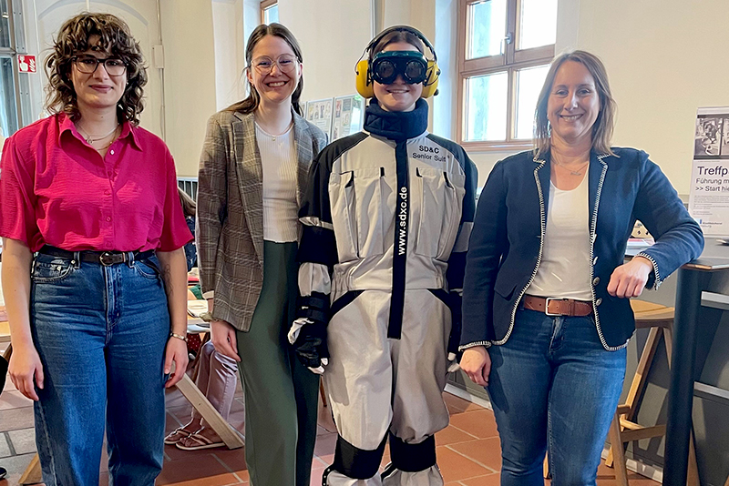 Drei Studentinnen der DHBW Ravensburg haben in einem Studienprojekt das Optimierungspotenzial der Stadtbücherei Ravensburg für ältere Menschen untersucht. Dazu stand ihnen der AgeSuit der Hochschule zur Verfügung. Mit ihm konnten die Studentinnen die Einrichtungen und den Service der Bücherei gründlich testen. Der Anzug simuliert wie es ist, mit verringertem Hör- und Sehvermögen oder eingeschränkter Beweglichkeit unterwegs zu sein. Bei der Jubiläumsfeier der Bücherei hatten die Studentinnen gemeinsam mit Prof. Dr. Anja Brittner-Widmann, Studiengangsleiterin BWL – Tourismus, Hotellerie und Gastronomie, eine Führung in dem AgeSuit angeboten.