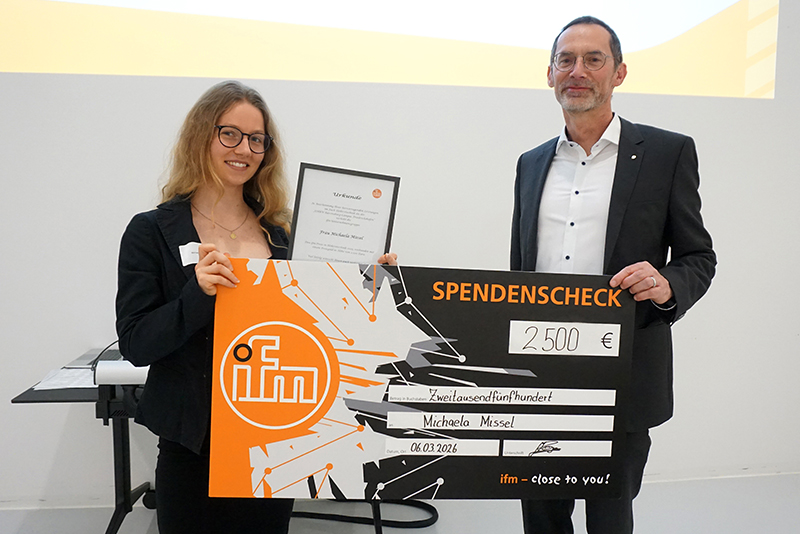 Jörg Poser, Vice President Technical Management bei der ifm Group, verlieh ihr als beste Absolventin in der Elektrotechnik dafür einen Preis. Sein Credo ist, die Elektrotechnik voranzustellen als Technologie, die für Wettbewerbsfähigkeit und den wirtschaftlichen Erfolg entscheidend ist.